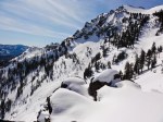 The next day we hiked Mt. Tellac with Dave’s fiance, Kim. She’d been up there before, and suggested we ski another couloir called “The Cross”. The line we took was plenty steep but not as narrow as the “Hall of God”. Here’s a photo showing the cross, as well as one I took from the top showing the line we skied: