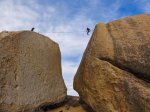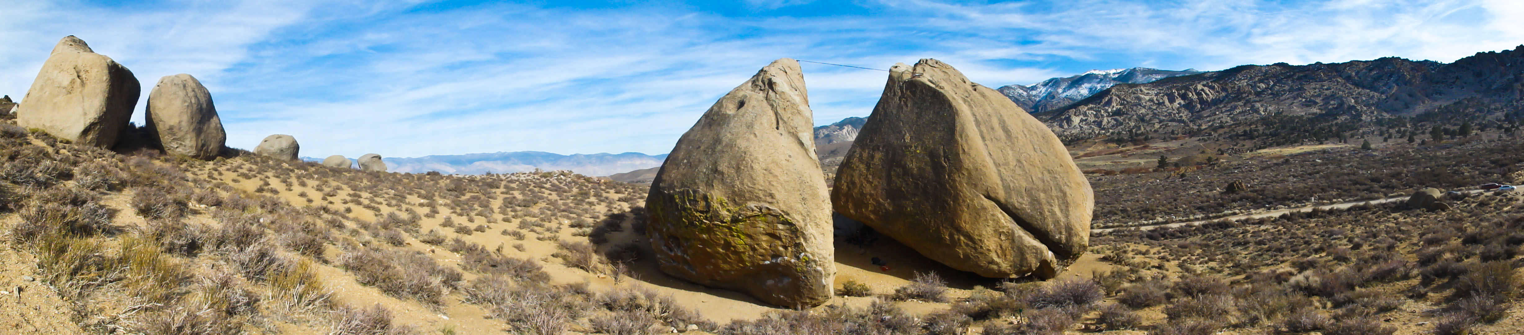 I met a cool crew of climbers from Casper, Wyoming. They were setting up a highline between the two largest boulders in the Buttermilks. I went to check it out, since I’ve been wanting to set up a highline for years. The guy on top, Ryan, invited me up immediately to try it. I was hesitant at first, but I decided to at least check out his set up to see how he rigged it and such. It was the safest setup I’ve ever seen. The line was 1″ webbing, standard slackline material and length. Taped to the bottom of the webbing was a dynamic climbing rope as a safety backup. Each side had three expansion bolt anchors, the same type I trust my life to when climbing. He also used a dynamic rope for a tether, attached from the climbing harness to the highline by a figure 8 rappel device. This was backed up by a secondary tether as well, an unnecessary but comforting extra backup. After examining the setup, I felt totally comfortable taking whips out there. I decided to give it a go.